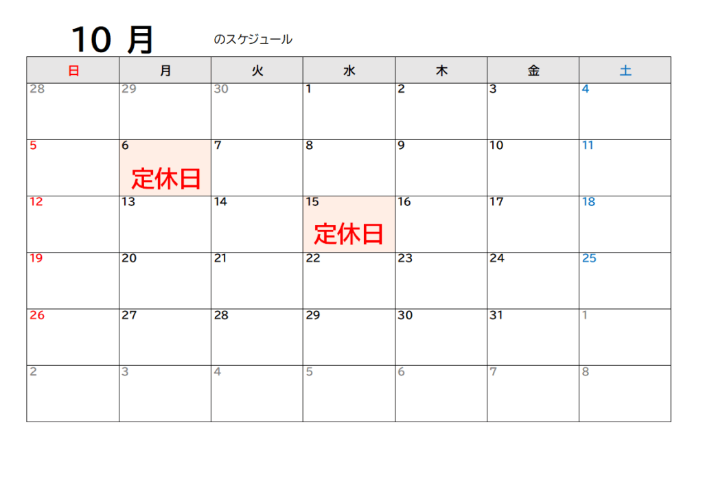 10月の定休日は10月6日(月)、10月15日(水)です。